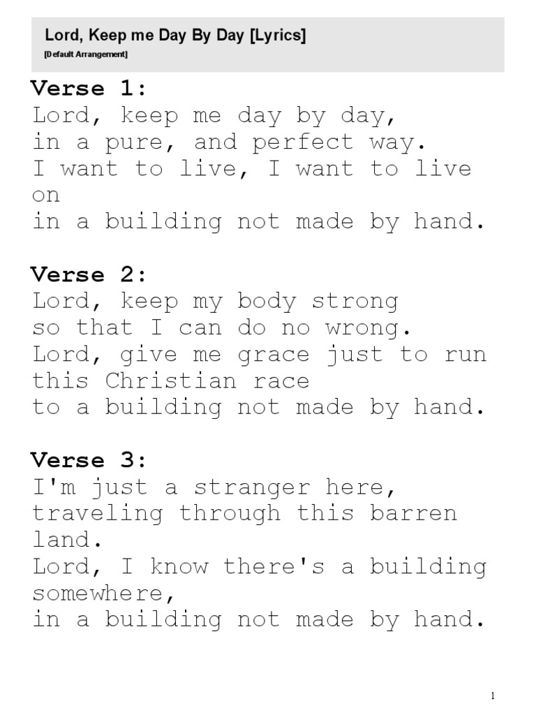 Lord, Keep Me Day by Day Lyrics PDF PDF Le'andria Johnson Lord Keep Me By Day Lyrics I want to live, i want to live on in a. I want to live, i want to live on in a building. Lord, keep my day by day, in a pure and perfect way. I want to live, i want to live on in a building not made by. I want to live, i want. Lord, keep me day. Le'andria Johnson Lord Keep Me By Day Lyrics.
